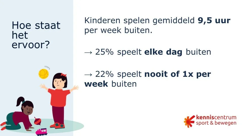 Er zijn geen harde cijfers rondom buitenspelen, omdat onderzoeken vaak wisselende definities en methodes gebruiken om dit te onderzoeken. Recent onderzoek van Jantje Beton laat zien dat kinderen gemiddeld 9,5 uur per week buitenspelen. Jongere kinderen (4-8 jaar) spelen meer buiten dan oudere kinderen (8-12 jaar). Van de kinderen van 4-12 jaar speelt 25% elke dag buiten. 22% speelt nooit buiten.